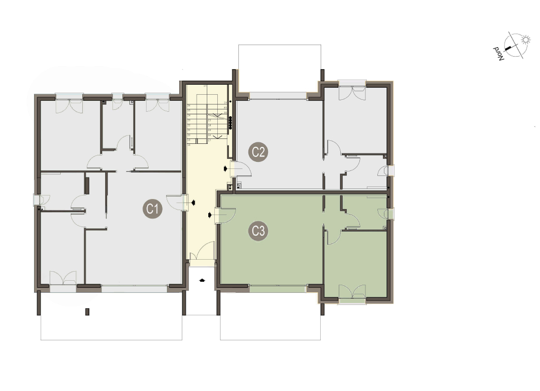 Quadrilocale a Piano Primo con soggiorno cucina a vista, due bagni, disimpegno, due camere e uno studio e terrazzo di 24 mq. Classe energetica A3 (valore di progetto).