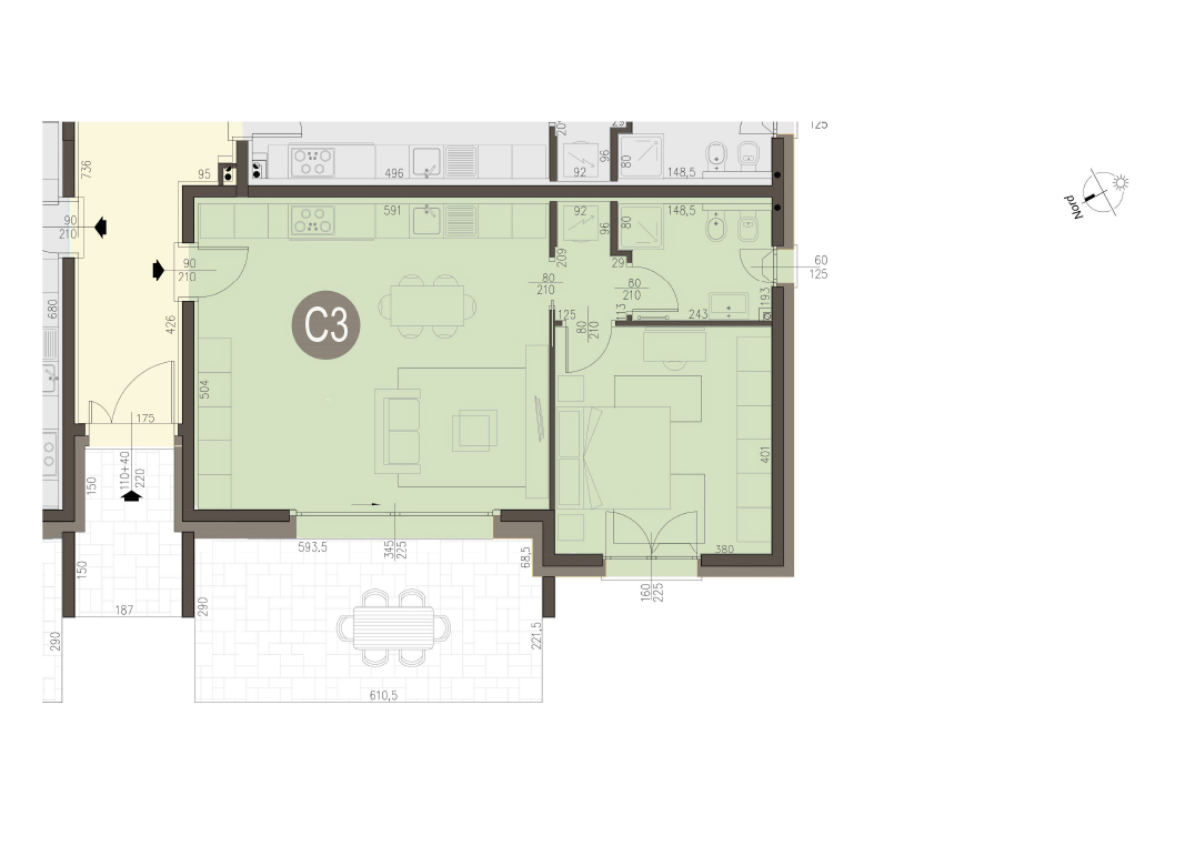 Bilocale Piano Terra con soggiorno con cucina a vista, camera, disimpegno, bagno, portico e giardino di prprietà di 105 mq. Classe energetica A3 (valore di progetto). Le immagini e la rappresentazione grafica dei prodotti (immagini, dati tecnici e descrizioni) è realizzata al solo scopo di illustrare il prodotto ed è puramente indicativa. I prodotti possono pertanto differire da quanto rappresentato.