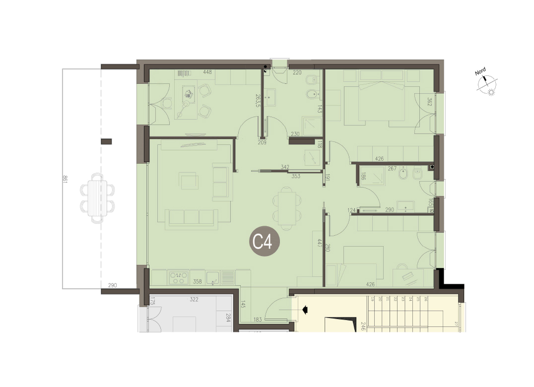 Quadrilocale a Piano Primo con soggiorno cucina a vista, due bagni, disimpegno, due camere e uno studio e terrazzo di 24 mq. Classe energetica A3 (valore di progetto). Le immagini e la rappresentazione grafica dei prodotti (immagini, dati tecnici e descrizioni) è realizzata al solo scopo di illustrare il prodotto ed è puramente indicativa. I prodotti possono pertanto differire da quanto rappresentato.