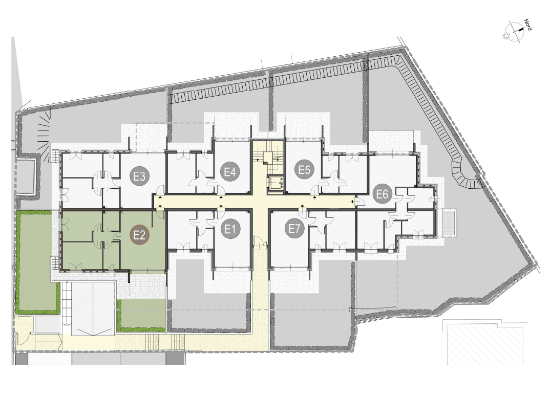 Bilocale a Piano Terra con soggiorno con cucina a vista, disimpegno, una camera, un bagno, portico e giardino di proprietò di 74 mq. Classe energetica A3 (valore di progetto).