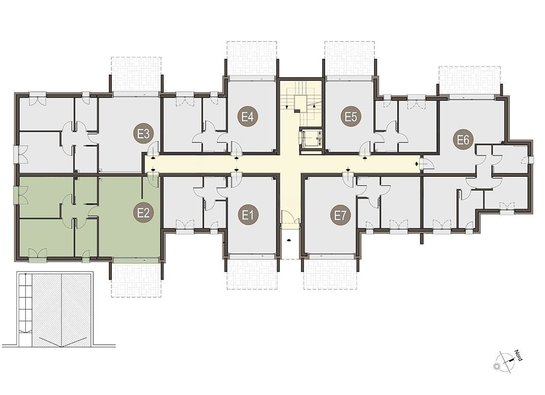 Trilocale a Piano Secondo con soggiorno con angolo cottura, disimpegno, due camere, due bagni e due terrazzi per un totale di 17 mq. Classe energetica A3 (valore di progetto).