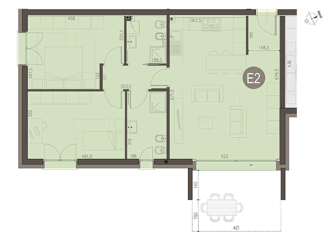 Trilocale a Piano Secondo con soggiorno con angolo cottura, disimpegno, due camere, due bagni e terrazzo di 12 mq. Classe energetica A3 (valore di progetto).