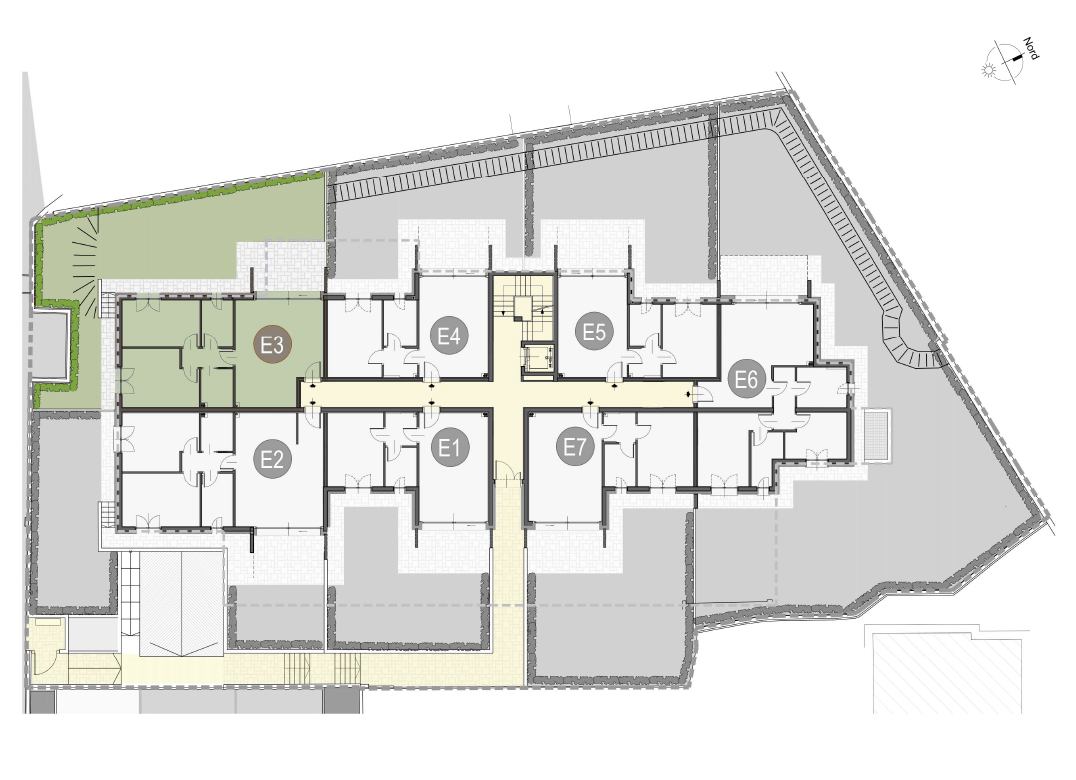 Trilocale a Piano Terra con soggiorno con angolo cottura, disimpegno, due camere, due bagni, portico e giardino di proprietà di 93 mq. Classe energetica A3 (valore di progetto).