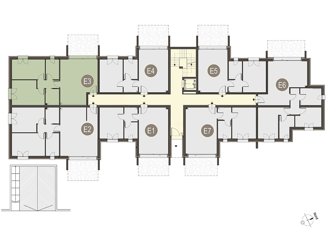 Trilocale a Piano Primo con soggiorno con angolo cottura, disimpegno, due camere, due bagni e due terrazzi per un totale di 17 mq. Classe energetica A3 (valore di progetto).