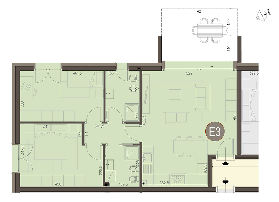 Trilocale a Piano Primo con soggiorno con angolo cottura, disimpegno, due camere, due bagni e terrazzo di 12 mq. Classe energetica A3 (valore di progetto).