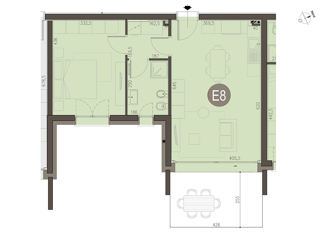 Bilocale a Piano Primo con soggiorno con cucina a vista, disimpegno, una camera, un bagno e terrazzo di 11 mq. Classe energetica A3 (valore di progetto). Le immagini e la rappresentazione grafica dei prodotti (immagini, dati tecnici e descrizioni) è realizzata al solo scopo di illustrare il prodotto ed è puramente indicativa. I prodotti possono pertanto differire da quanto rappresentato.