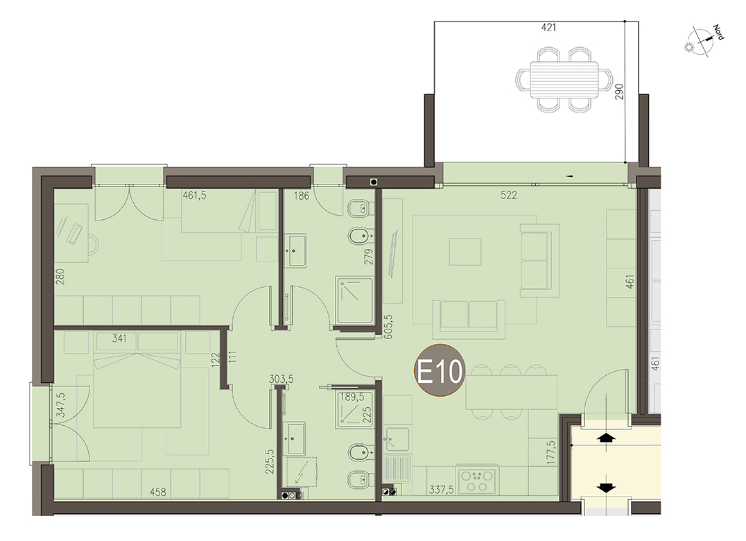 Trilocale a Piano Primo con soggiorno con angolo cottura, disimpegno, due camere, due bagni e terrazzo di 12 mq. Classe energetica A3 (valore di progetto). Le immagini e la rappresentazione grafica dei prodotti (immagini, dati tecnici e descrizioni) è realizzata al solo scopo di illustrare il prodotto ed è puramente indicativa. I prodotti possono pertanto differire da quanto rappresentato.