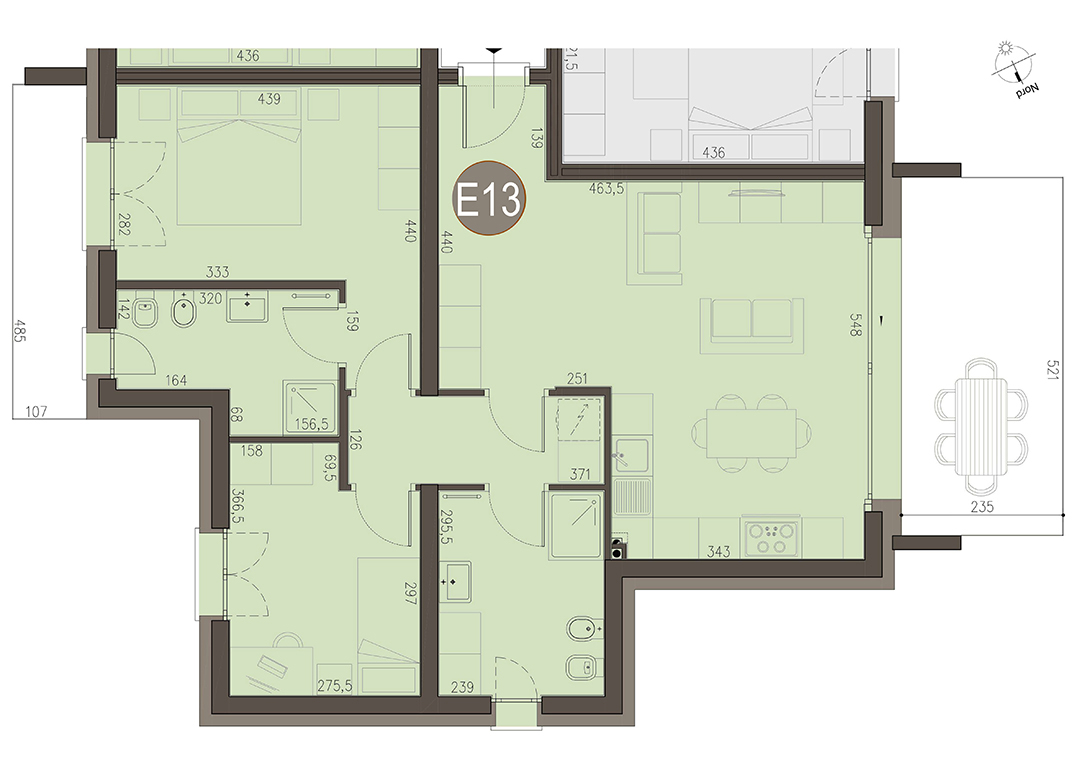Trilocale a Piano Primo con soggiorno con angolo cottura, disimpegno, due camere, due bagni e due terrazzi per un totale di 17 mq. Classe energetica A3 (valore di progetto). Le immagini e la rappresentazione grafica dei prodotti (immagini, dati tecnici e descrizioni) è realizzata al solo scopo di illustrare il prodotto ed è puramente indicativa. I prodotti possono pertanto differire da quanto rappresentato.