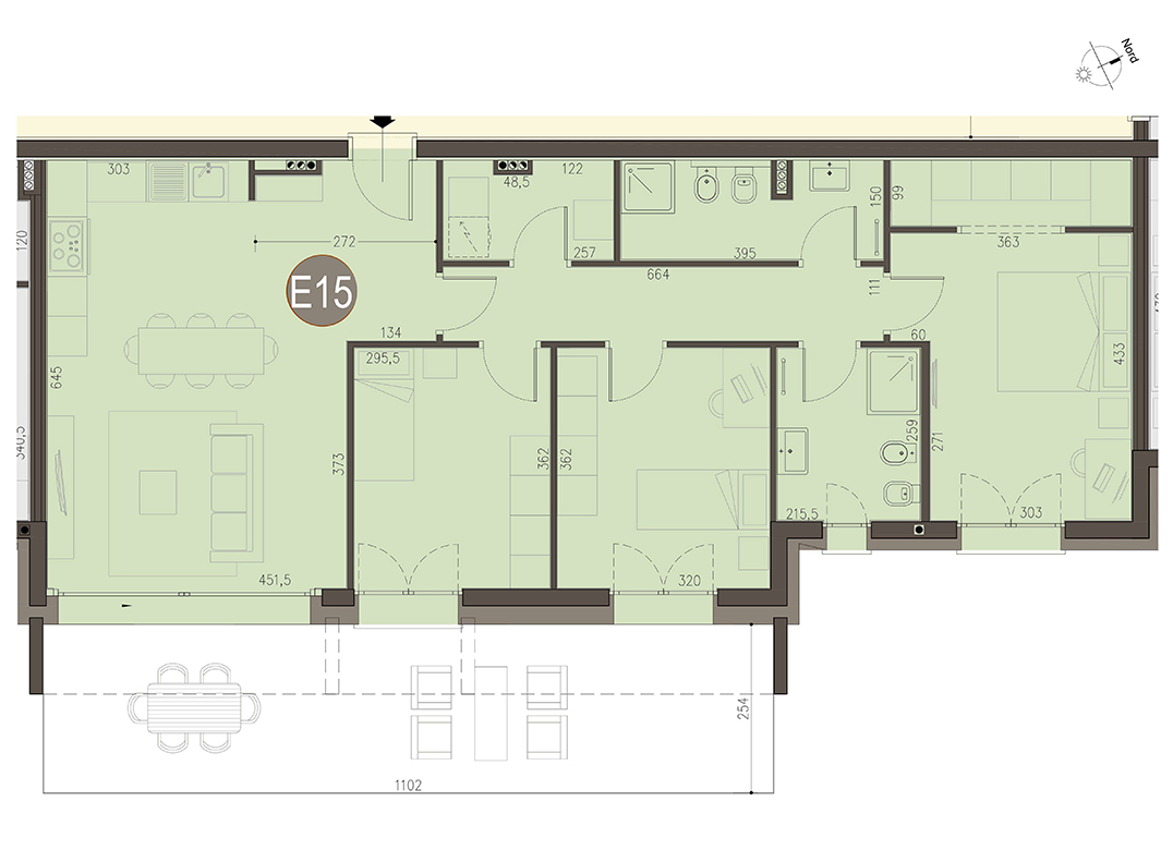 Trilocale a Piano Terra con soggiorno con angolo cottura, disimpegno, due camere, due bagni, portico e giardino di proprietà di 93 mq. Classe energetica A3 valore di progetto.