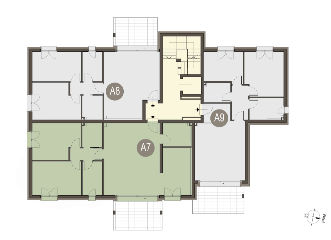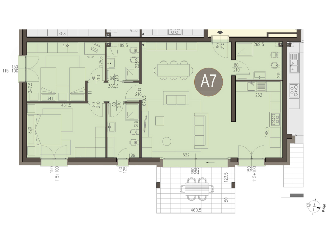 Trilocale a Piano Primo con ingresso, soggiorno con cucina a vista, due camere, due bagni, disimpegno e terrazzo di 12 mq. Classe energetica A3 (valore di progetto).