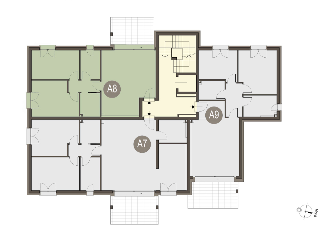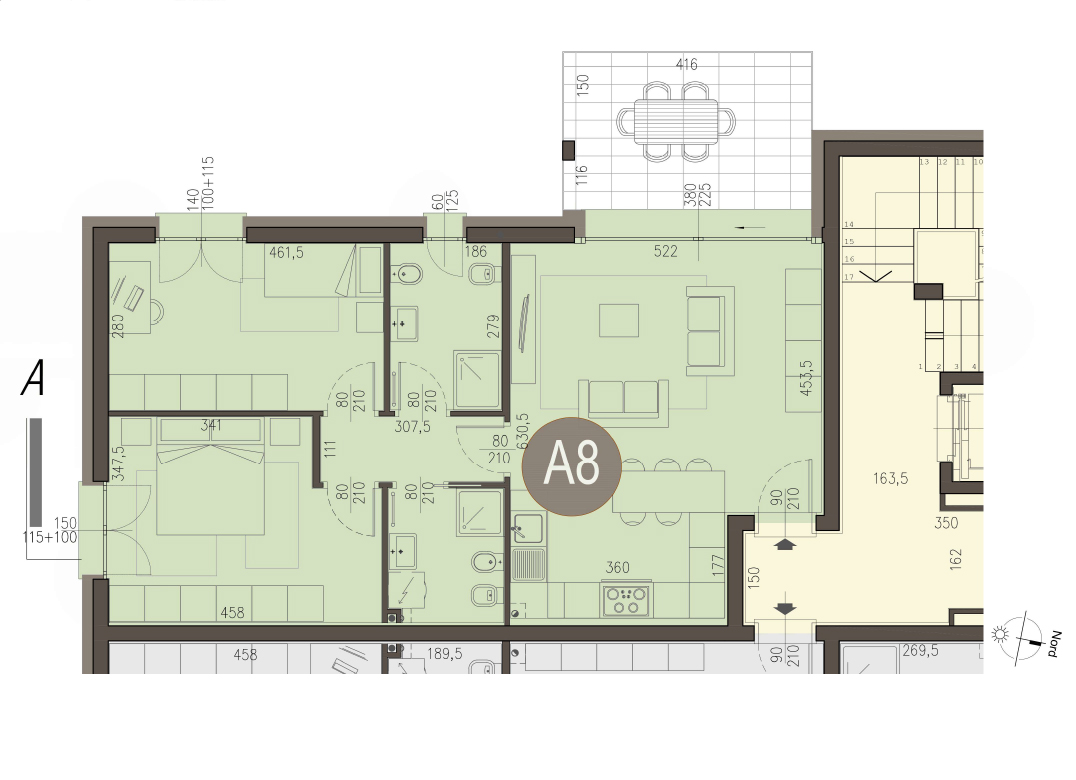 Trilocale a Piano Primo con ingresso, soggiorno con cucina a vista, due camere, due bagni, disimpegno e terrazzo di 12 mq. Classe energetica A3 (valore di progetto).