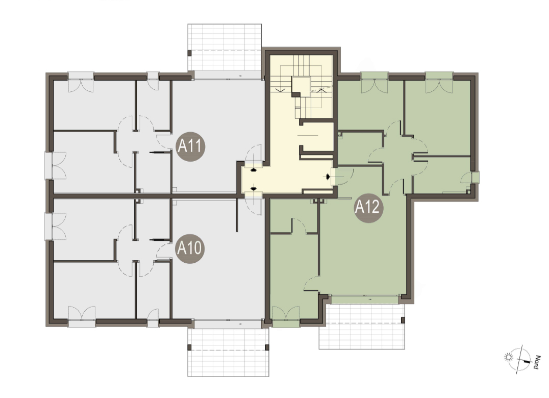 Trilocale a Piano Primo con ingresso, soggiorno con cucina a vista, due camere, due bagni, disimpegno e terrazzo di 12 mq. Classe energetica A3 (valore di progetto).