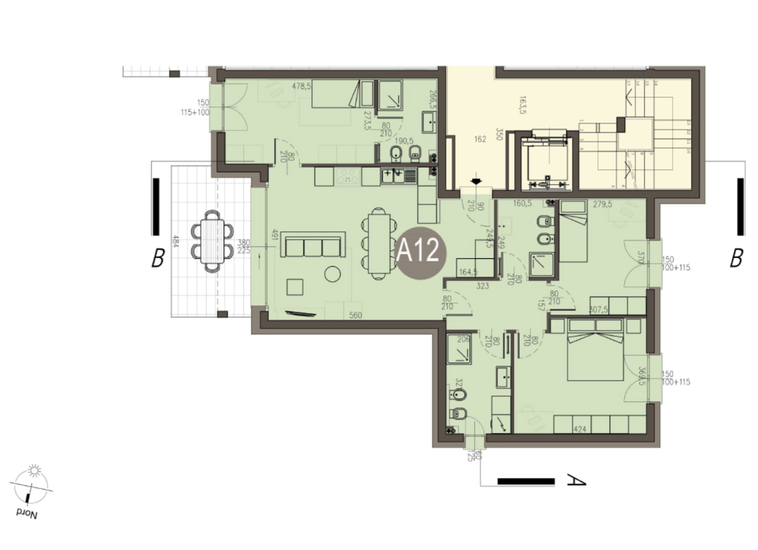 Trilocale a Piano Secondo con soggiorno con angolo cottura, due camere, due bagni, disimpegno, lavanderia e terrazzo di 12 mq. Classe energetica A3 (valore di progetto).