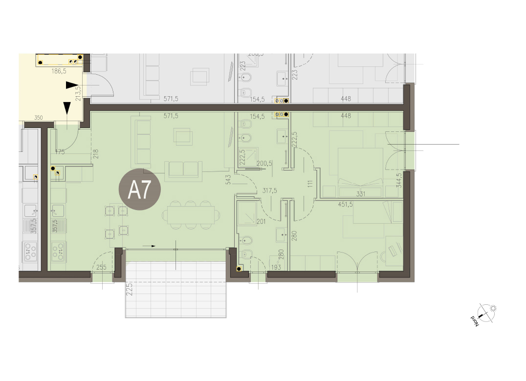 Trilocale a Piano Primo con ingresso, soggiorno con angolo cottura, due camere, due bagni, disimpegno e terrazzo di 9 mq. Classe energetica A3 (valore di progetto).