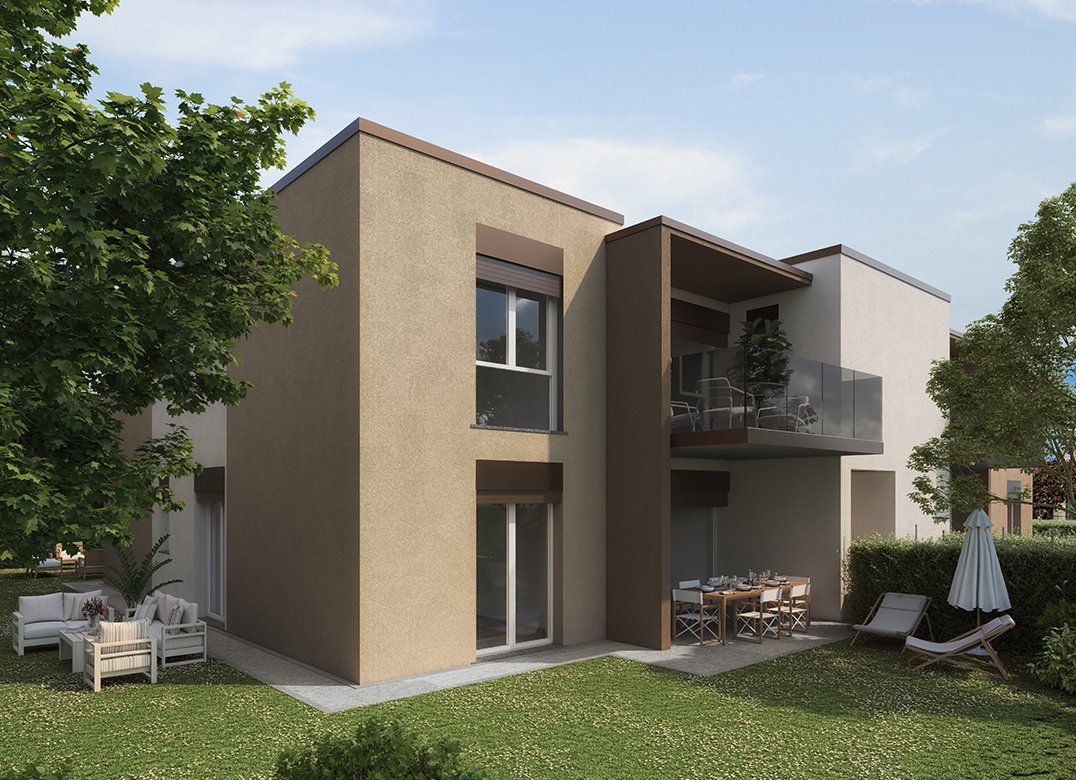 Trilocale a Piano Terra con ingresso, soggiorno con angolo cottura, due camere, due bagni, disimpegno, portico e giardino di proprietà di 160 mq. Classe energetica A3 (valore di progetto).