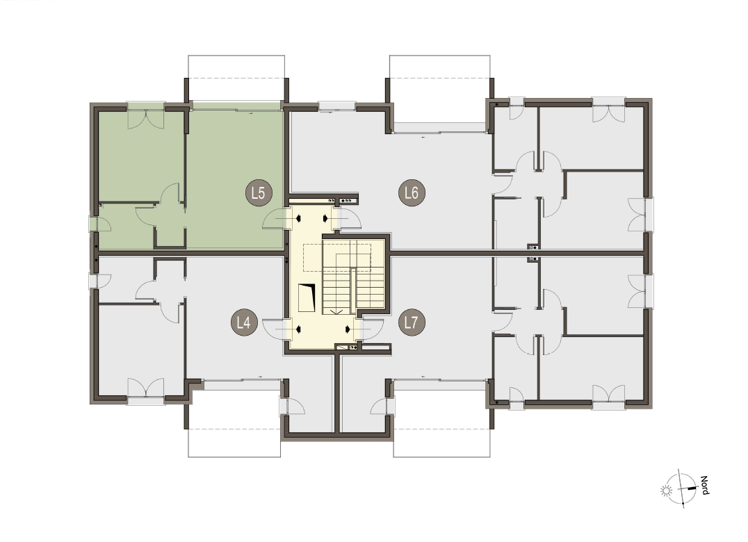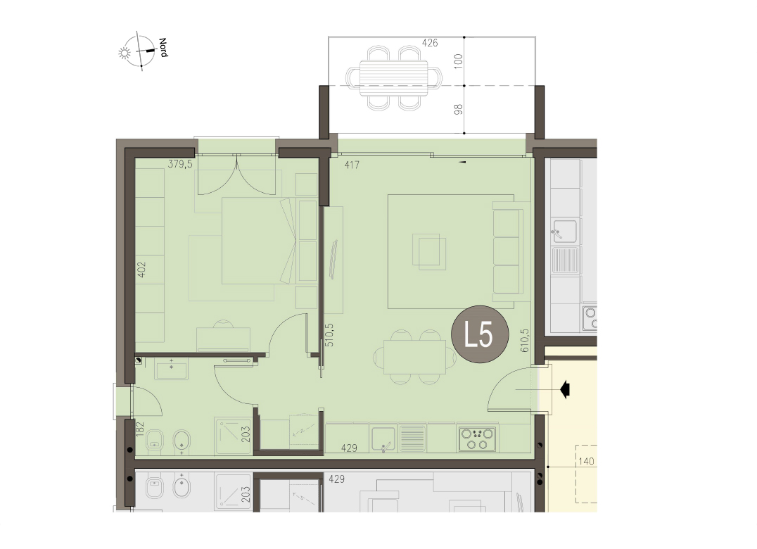 Bilocale a Piano Primo con soggiorno con cucina a vista, una camera, un bagno, disimpegno e terrazzo di 9 mq. Impianto fotovoltaico privato da 2kw. Classe energetica A3 (valore di progetto).
