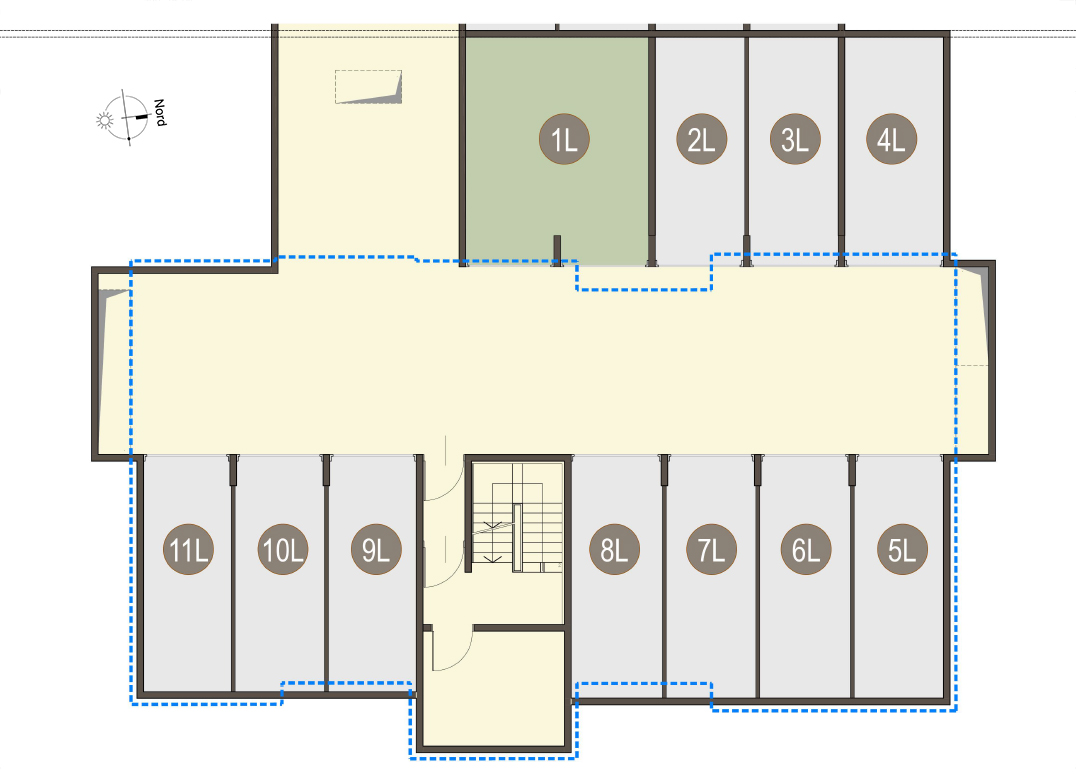 Bilocale a Piano Primo con soggiorno con angolo cottura, una camera, un bagno, disimpegno e terrazzo di 13 mq. Impianto fotovoltaico privato da 2kw. Classe energetica A3 (valore di progetto).