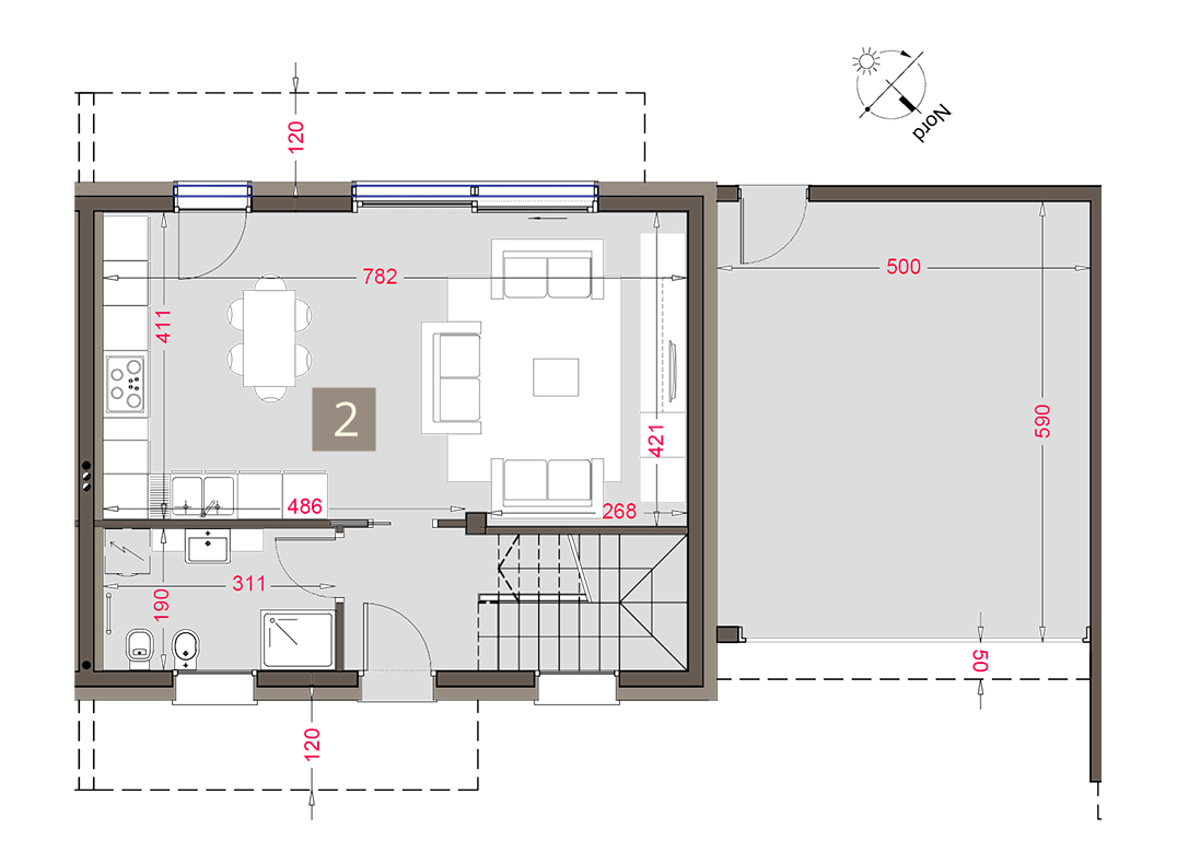 Terraced house consisting of large living room with kitchenette, three bedrooms, two bathrooms, and garden of property sqm. 41; with double garage. Energy class not less than A3. Energy performance during release.