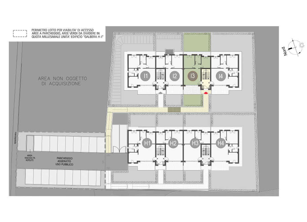 Three-room apartment on the ground floor composed of living-cooking, two bedrooms, two bathrooms, porch and two hallway. Garden of mq. 261,43. Energy class not less than A3 (indicative design value).