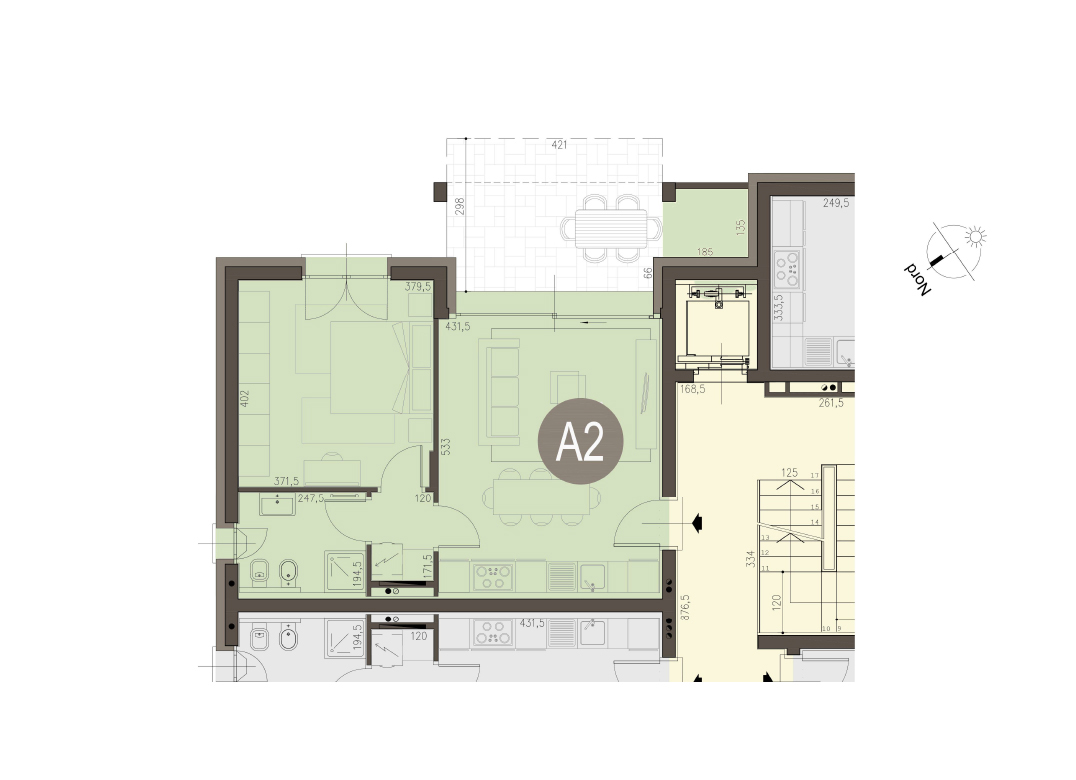 Two-room apartment on the ground floor with living room with kitchen, a bedroom, a bathroom, hallway, porch and garden of 121 square meters. Energy class A3 design value.