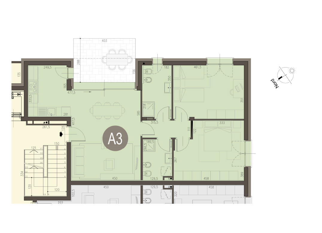 Three-room apartment on the ground floor with living room with kitchenette, two bedrooms, two bathrooms, porch and garden of 180 sqm. Energy class A3 design value.