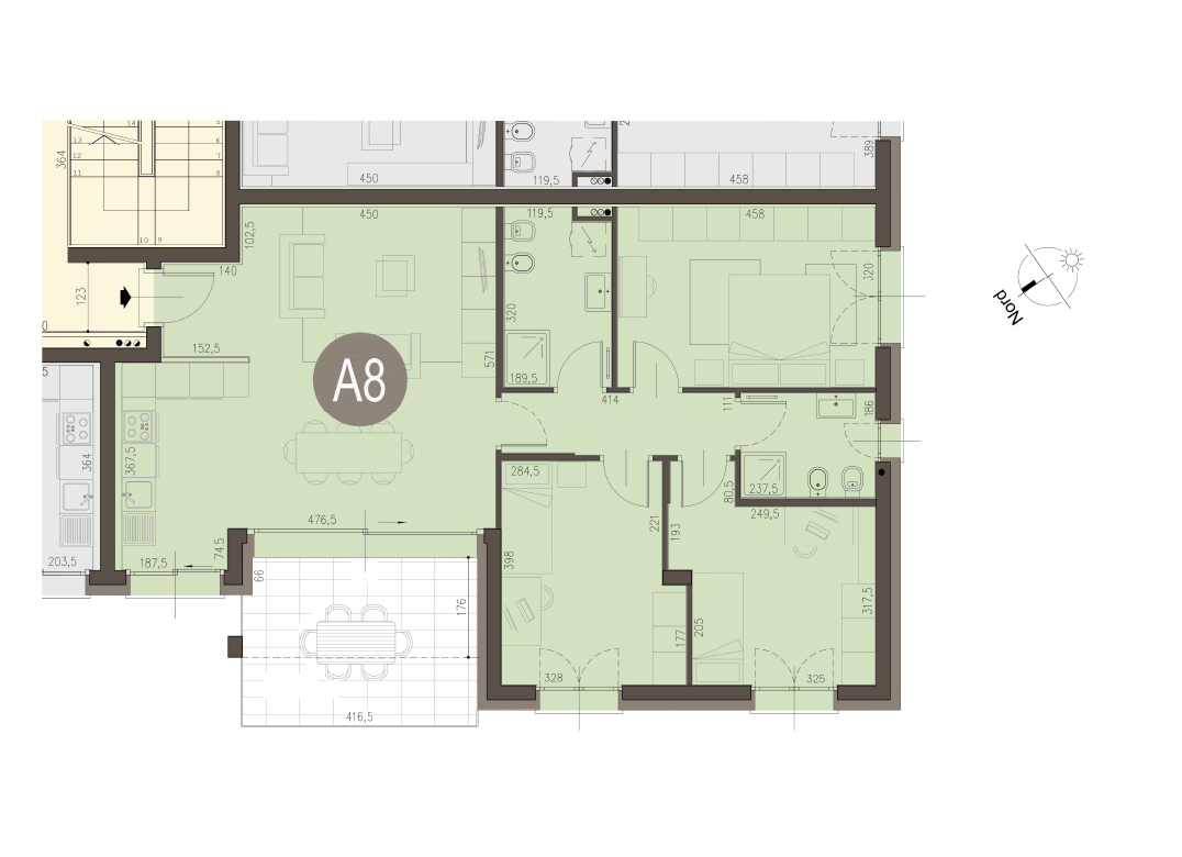 Three-room apartment on the second floor with living room with kitchenette, two bedrooms, two bathrooms and terrace of 12 sqm. Energy class A3 project value.