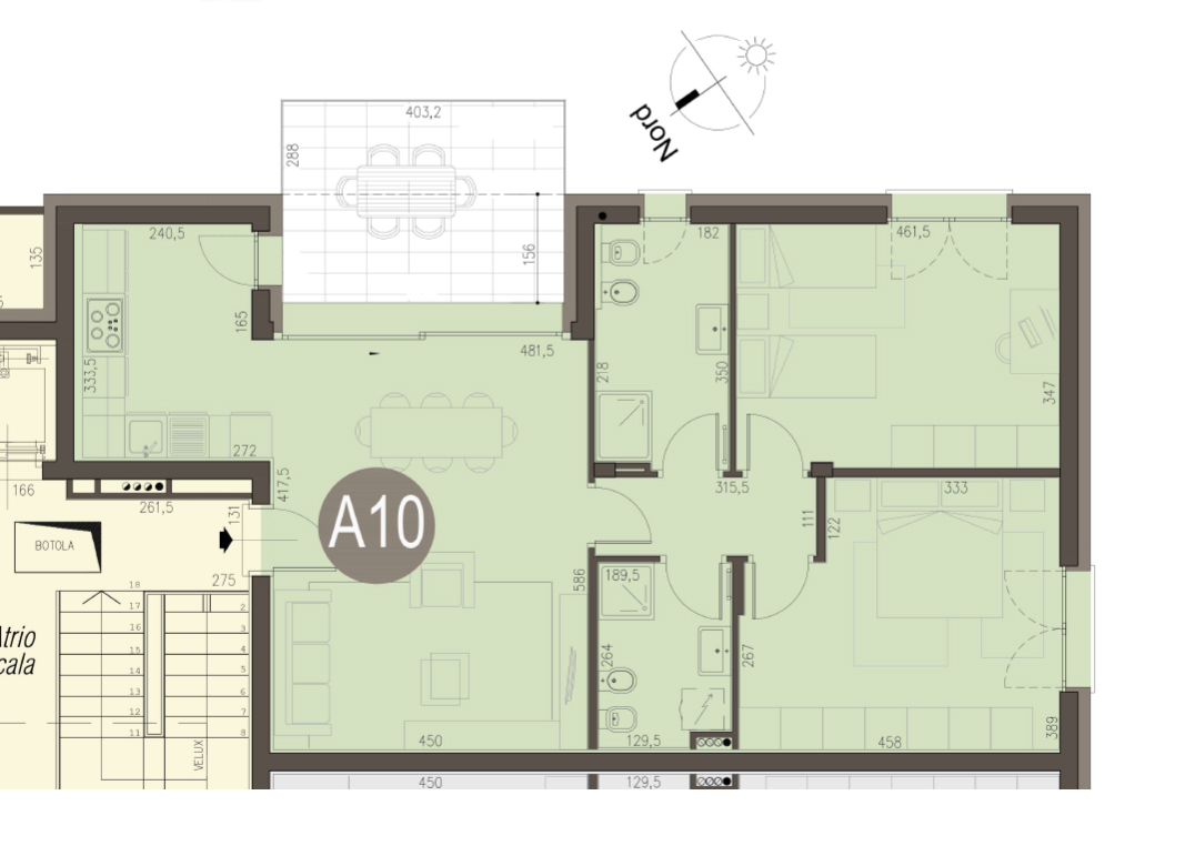 Four-room apartment on the second floor with living room with kitchenette, two bedrooms, a study, two bathrooms, two lobbies, a storage room and two terraces for a total of 23 square meters. Energy class A3 design value.