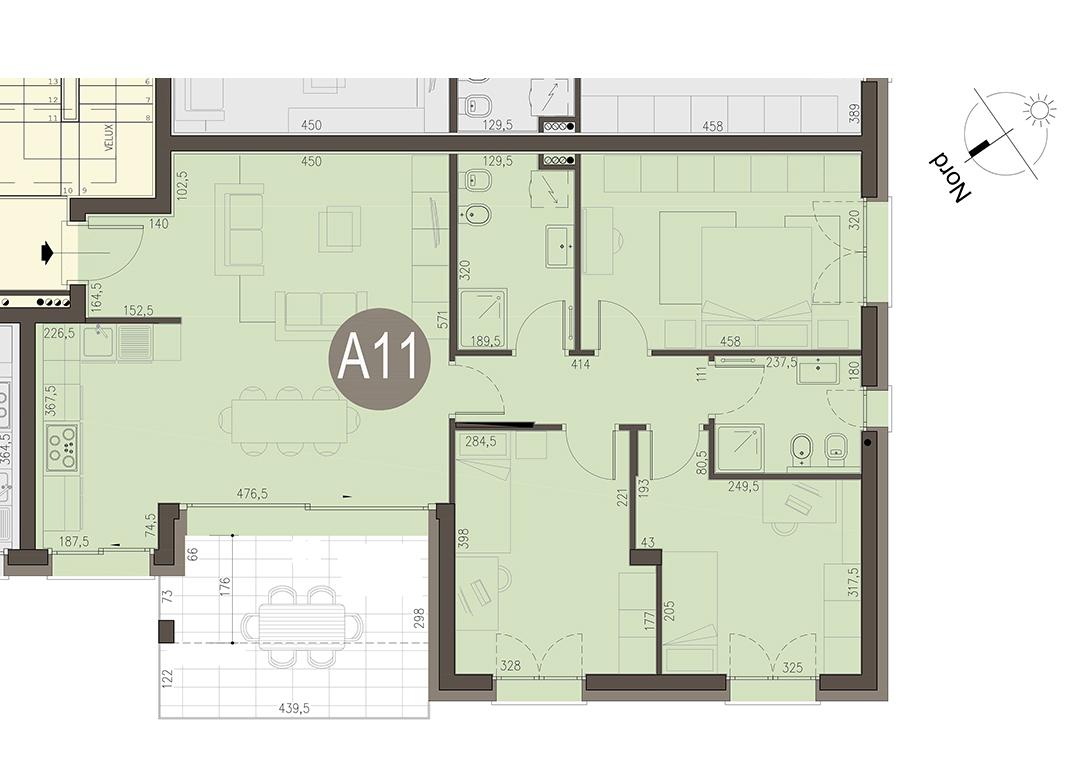 Three-room apartment on the second floor with living room with kitchenette, two bedrooms, two bathrooms and terrace of 12 sqm. Energy class A3 project value.