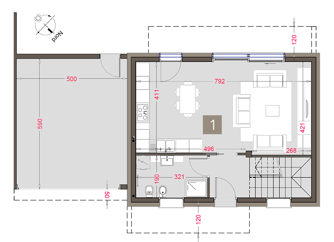 Terraced house consisting of large living room with kitchenette, three bedrooms, two bathrooms, and garden of property sqm. 41; with double garage. Energy class not less than A3. Energy performance during release.
