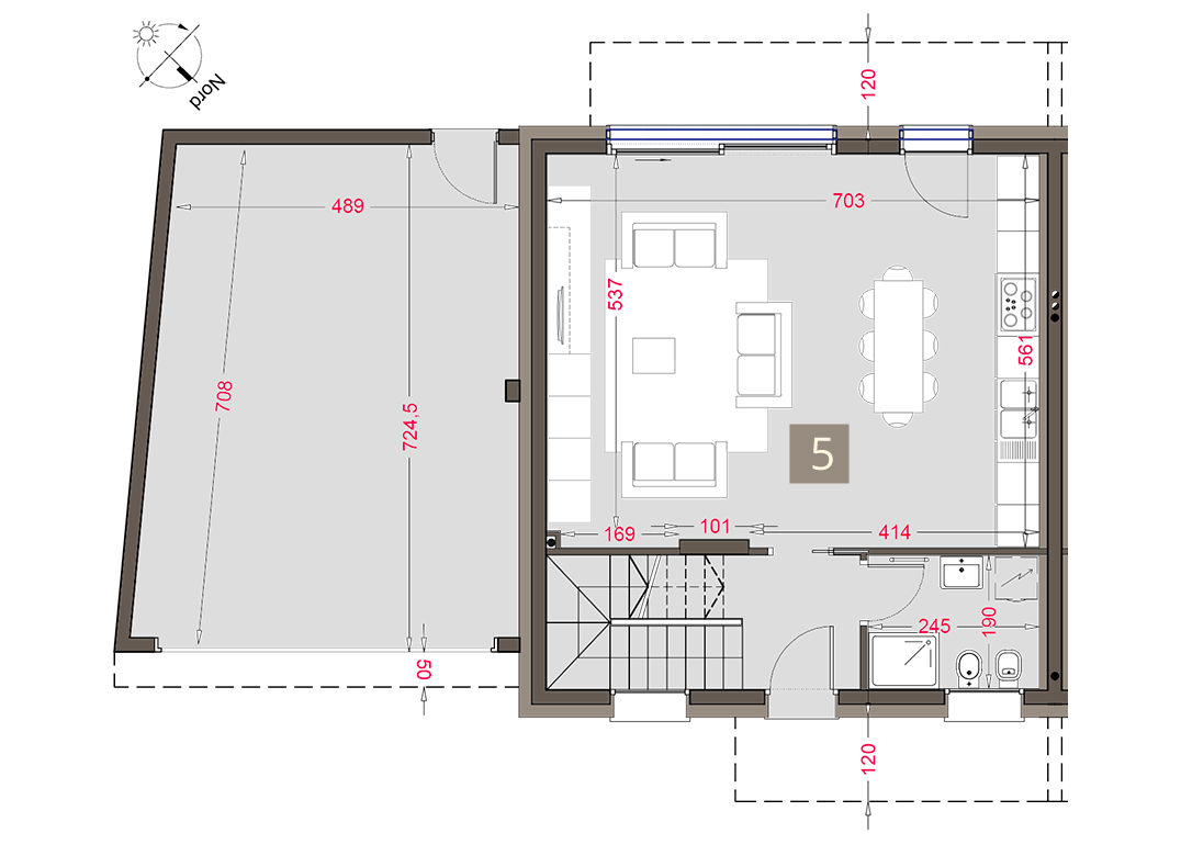 Terraced house consisting of large living room with kitchenette, three bedrooms, two bathrooms, and garden of property sqm. 161; with double garage. Energy class not less than A3. Energy performance during release.