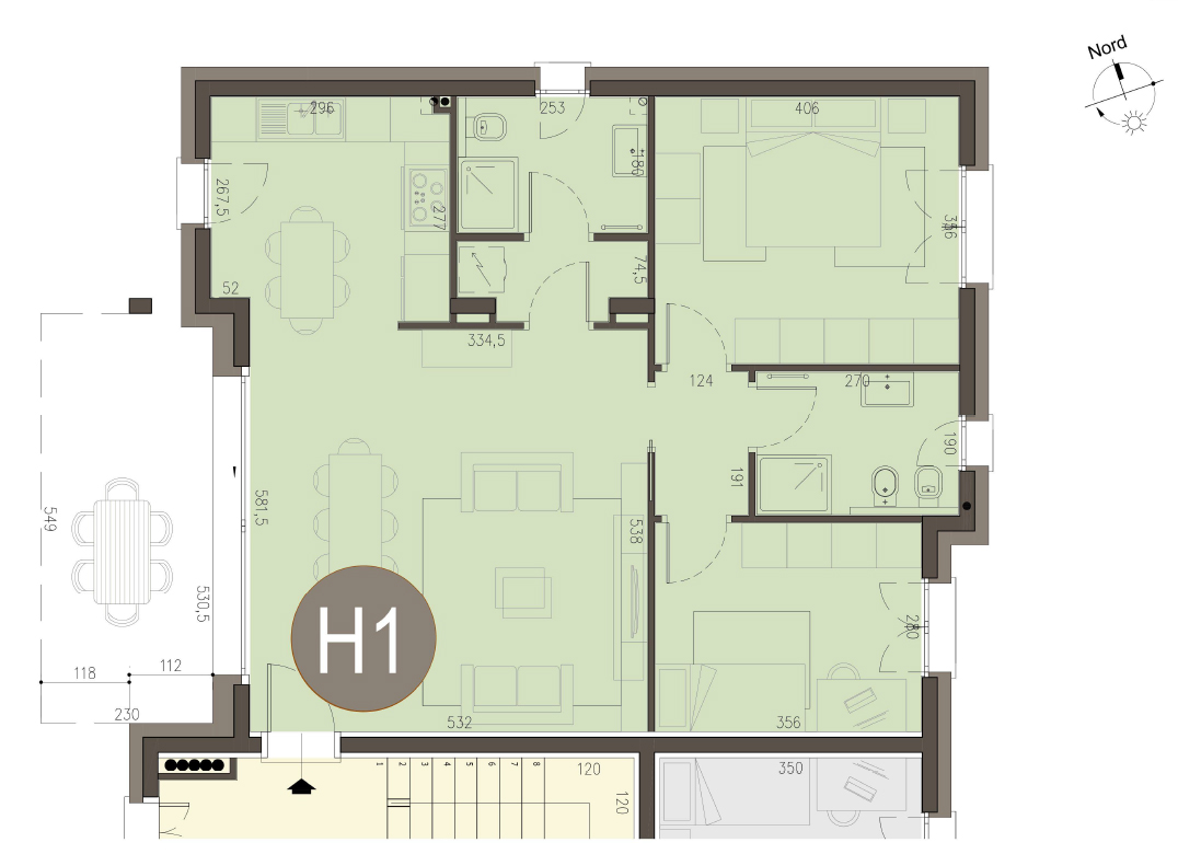 Three-room apartment on the ground floor composed of living-cooking, two bedrooms, two bathrooms, porch and two hallway. Garden of mq. 261,43. Energy class not less than A3 (indicative design value).