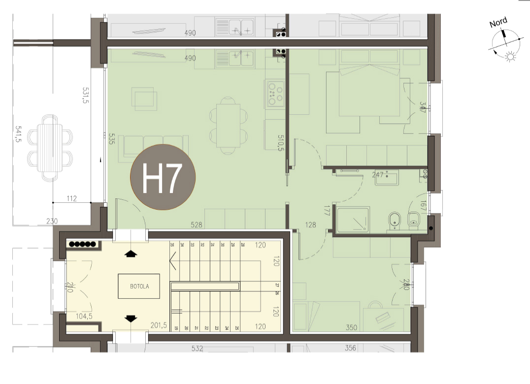 Three-room apartment on the first floor composed of living-cooking, two bedrooms, two bathrooms, two halls. Terrace of 12.54 sq. m. Energy class not less than A3 (indicative design value).