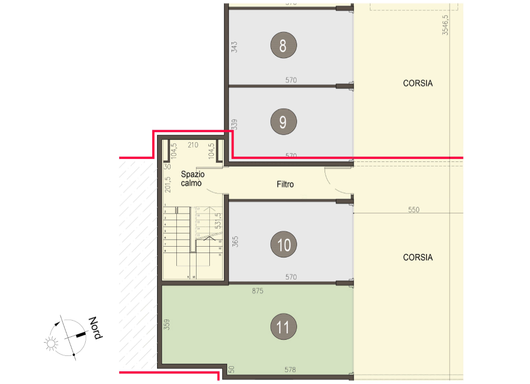 Three-room apartment on the first floor composed of living-cooking, two bedrooms, two bathrooms, two halls. Terrace of 12.54 sq. m. Energy class not less than A3 (indicative design value).