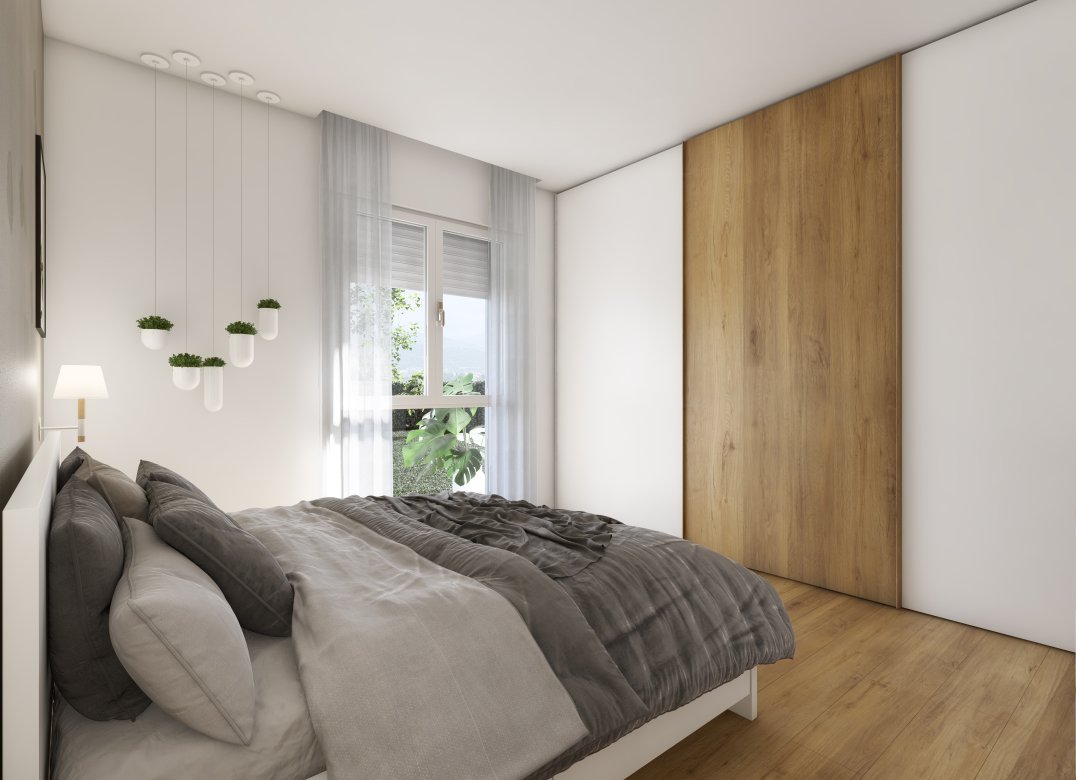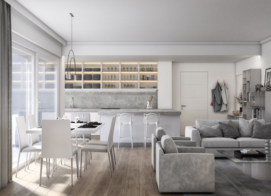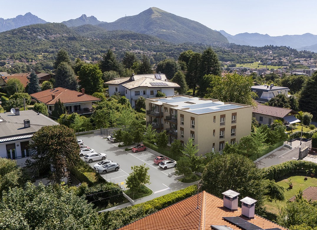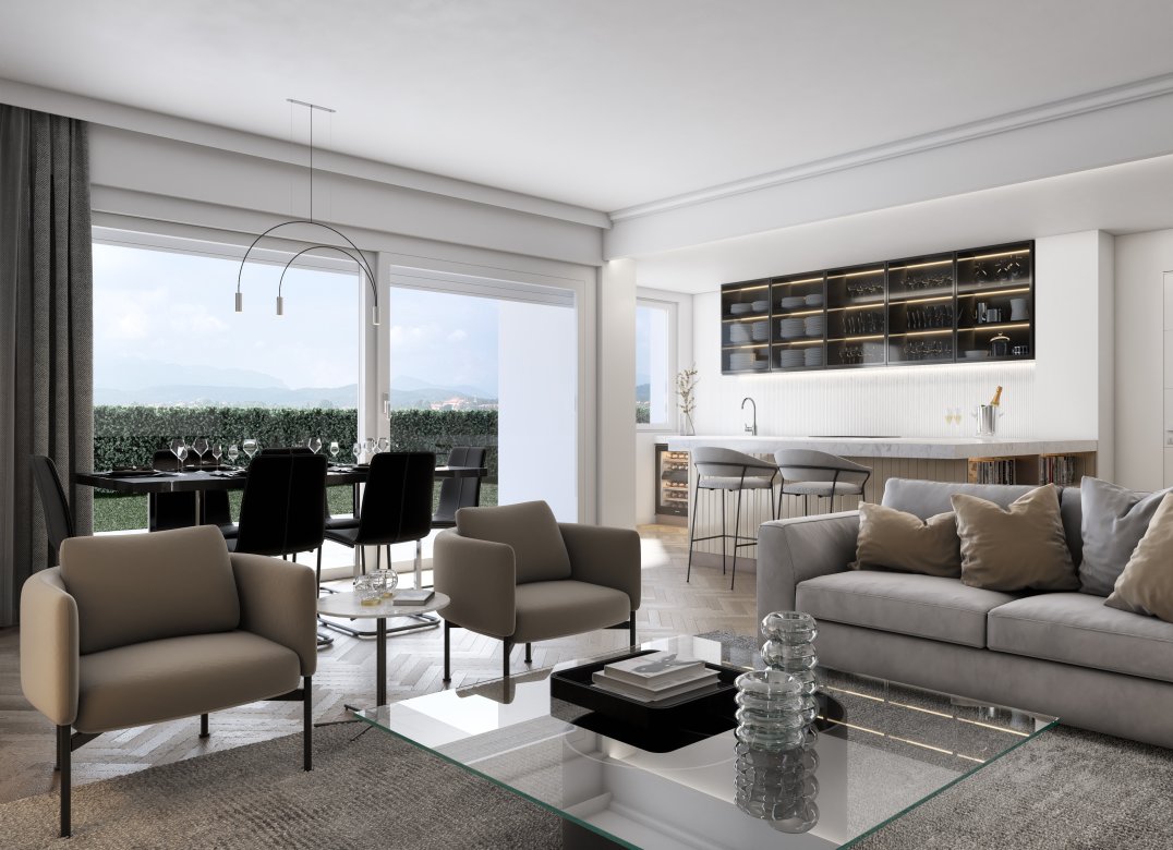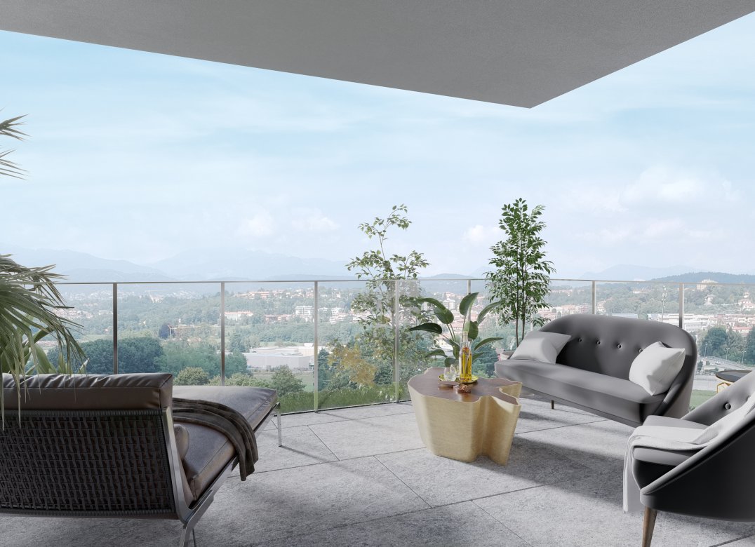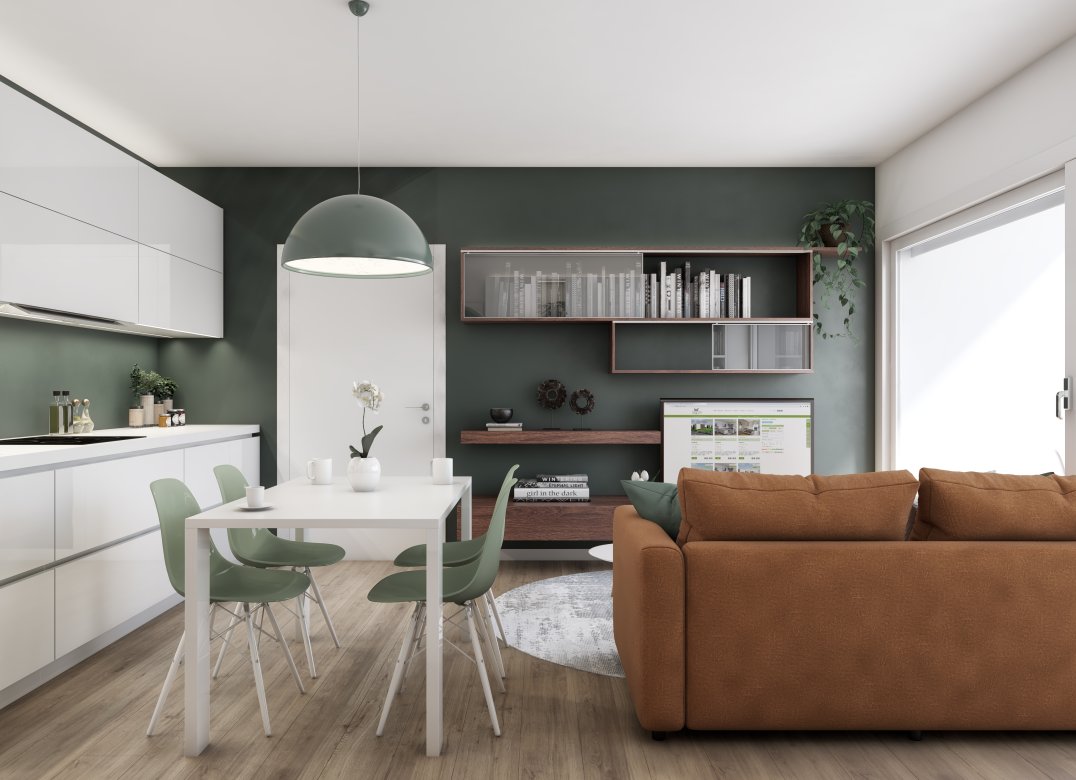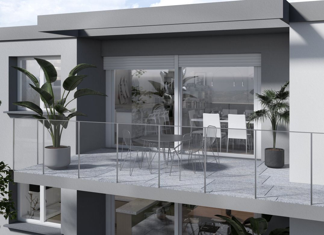 Four-room apartment on the second floor with living room with kitchenette, two bedrooms, a study, two bathrooms, two lobbies, a storage room and two terraces for a total of 23 square meters. Energy class A3 design value.