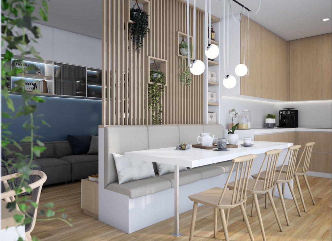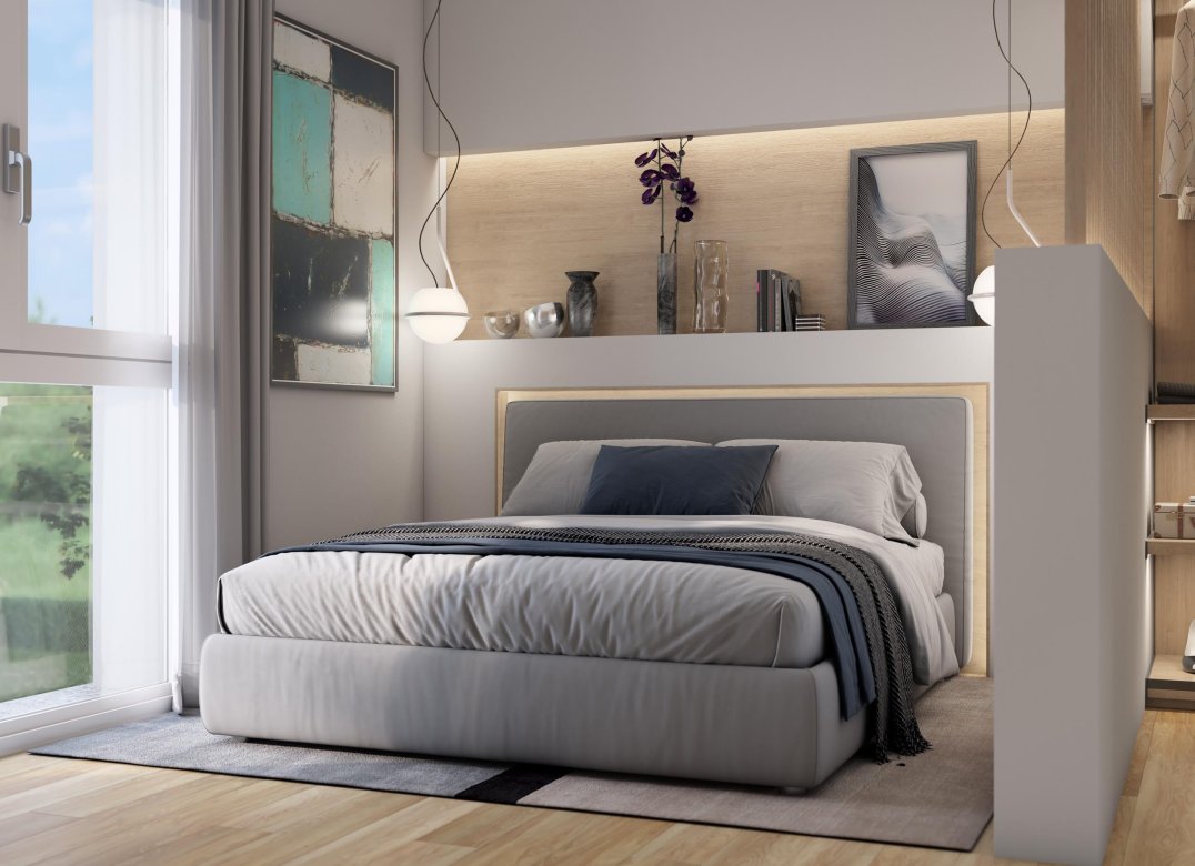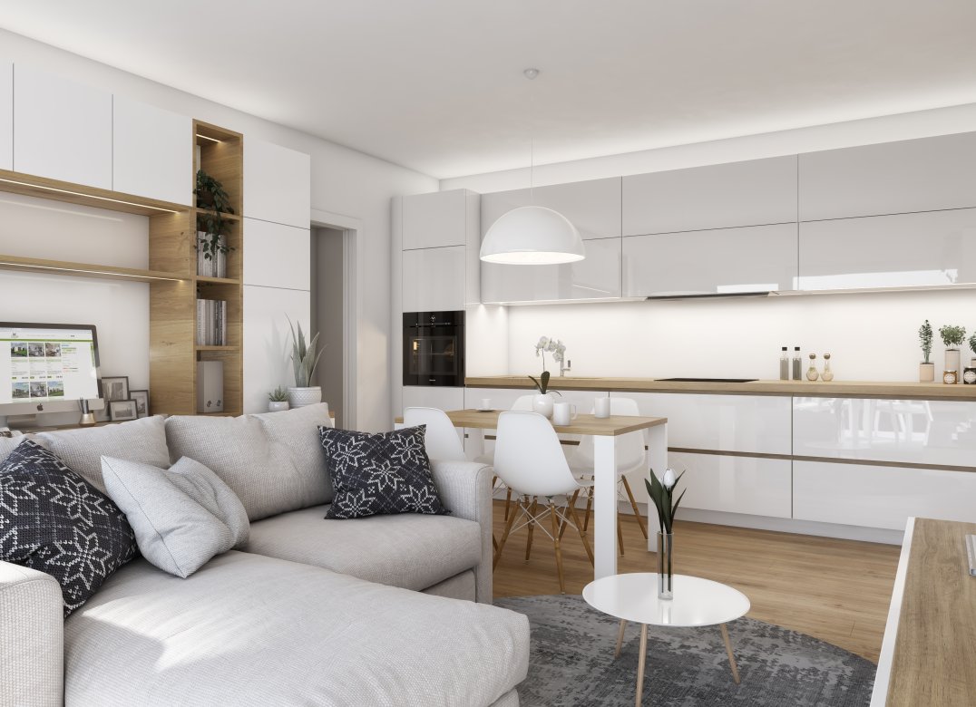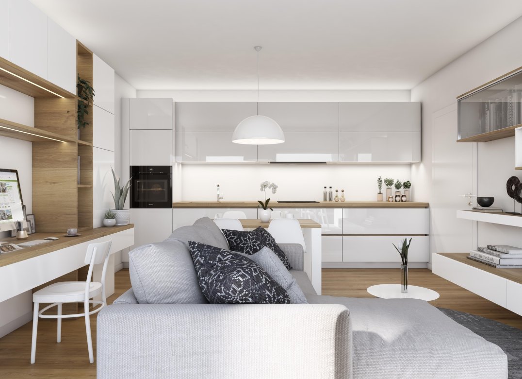 Four-room apartment on the second floor with living room with kitchenette, two bedrooms, a study, two bathrooms, two lobbies, a storage room and two terraces for a total of 23 square meters. Energy class A3 design value.