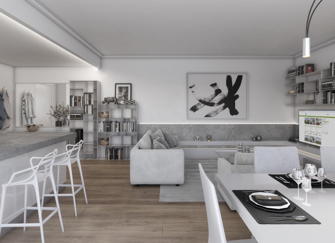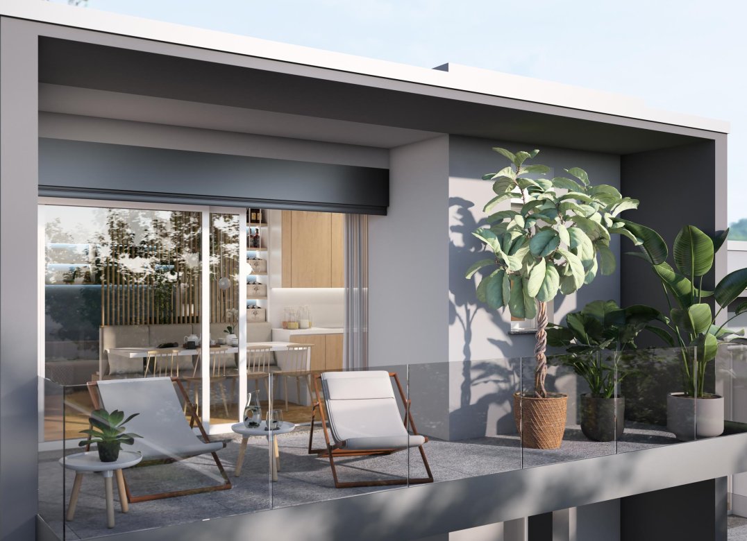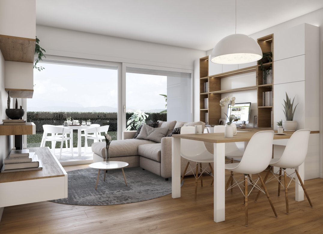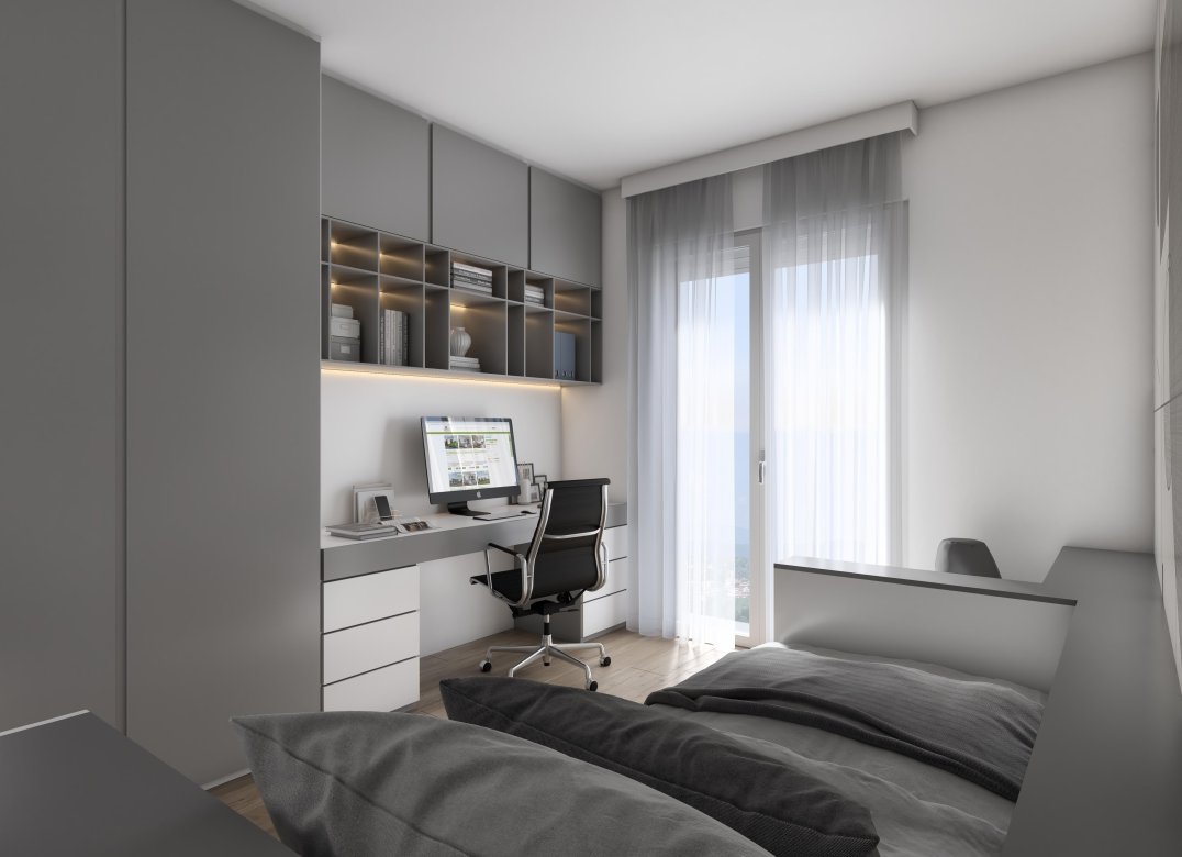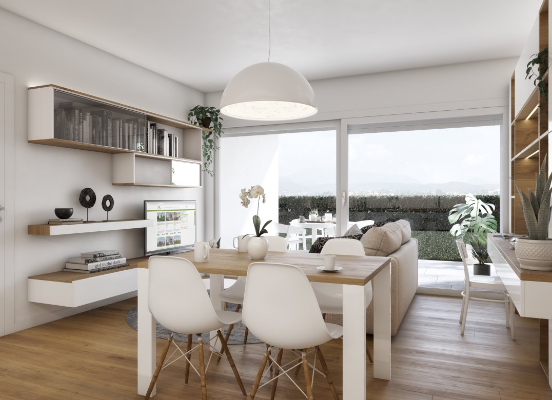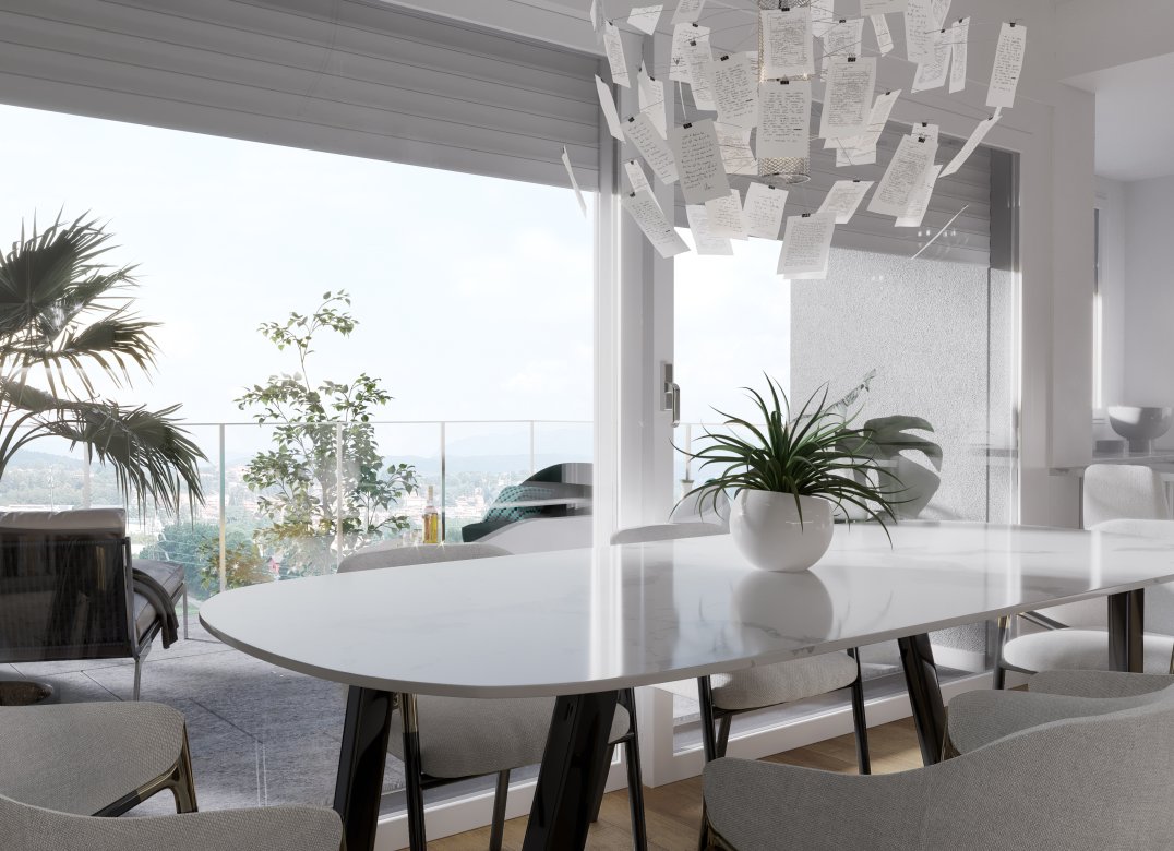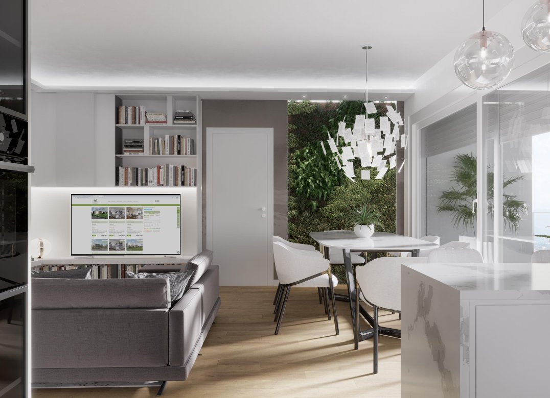 Four-room apartment on the second floor with living room with kitchenette, two bedrooms, a study, two bathrooms, two lobbies, a storage room and two terraces for a total of 23 square meters. Energy class A3 design value.